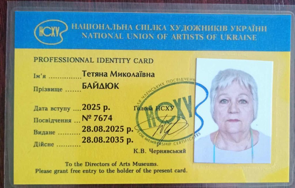 З нагоди професійного свята маємо особливу і приємну новину: керівник студій, соціальний працівник Тетяна Байдюк, напередодні Дня художника отримала членський квиток Національної спілки художників України! Цей успіх є визнанням її таланту та професіоналізму, а також підтвердженням високого рівня роботи, яку вона проводить із підопічними. Щиро вітаємо пані Тетяну з цим визначним досягненням! Бажаємо міцного здоров’я, невичерпного натхнення, миру й нових творчих звершень!