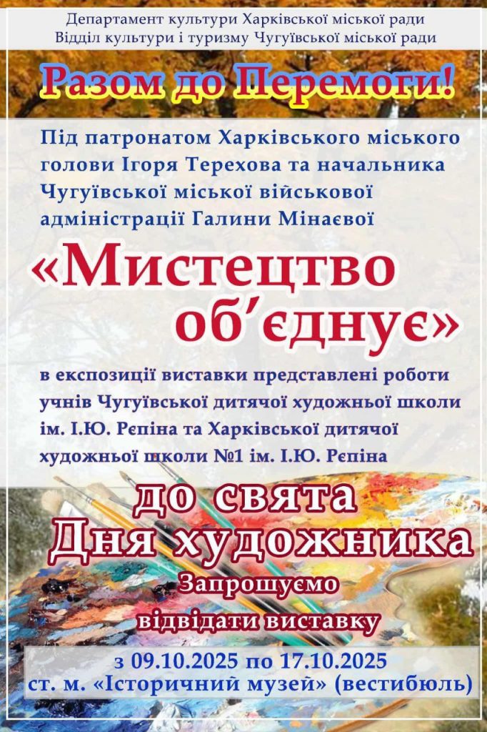 Завдяки співпраці Чугуївської міської ради з Харківським міським головою Ігорем Тереховим відбулася спільна виставка робіт учнів художніх шкіл Чугуєва та Харкова, приурочена до Дня художника України. Експозицію під назвою «Мистецтво об’єднує» протягом тижня можна було побачити на станції метро «Історичний музей» у Харкові.